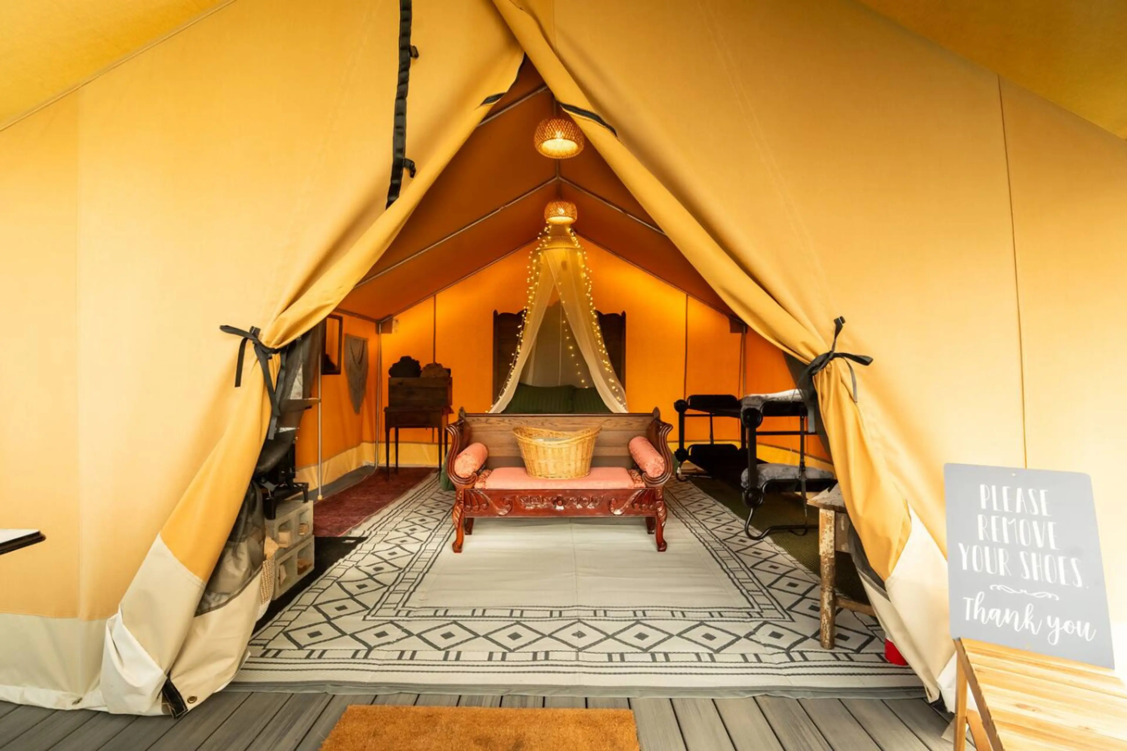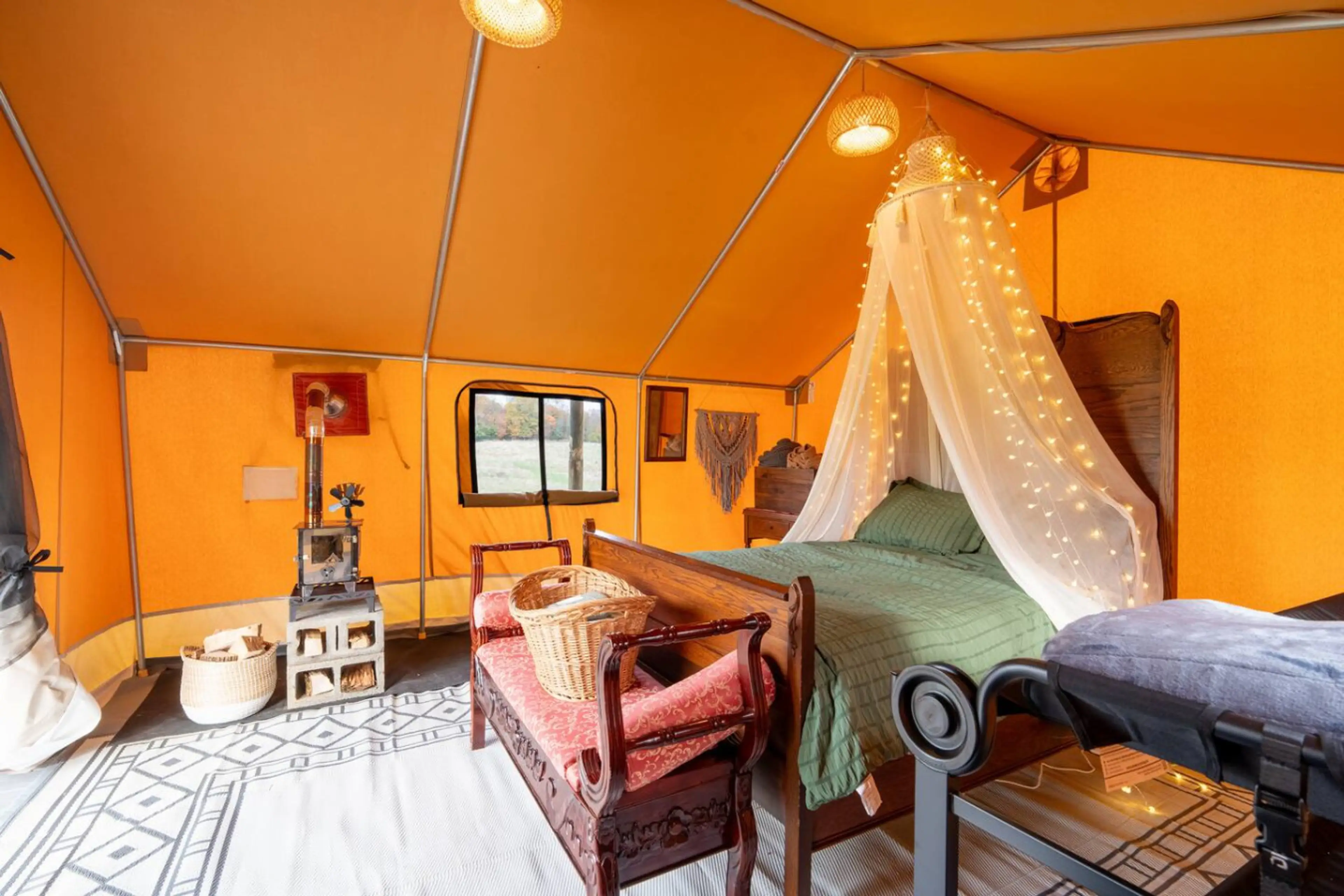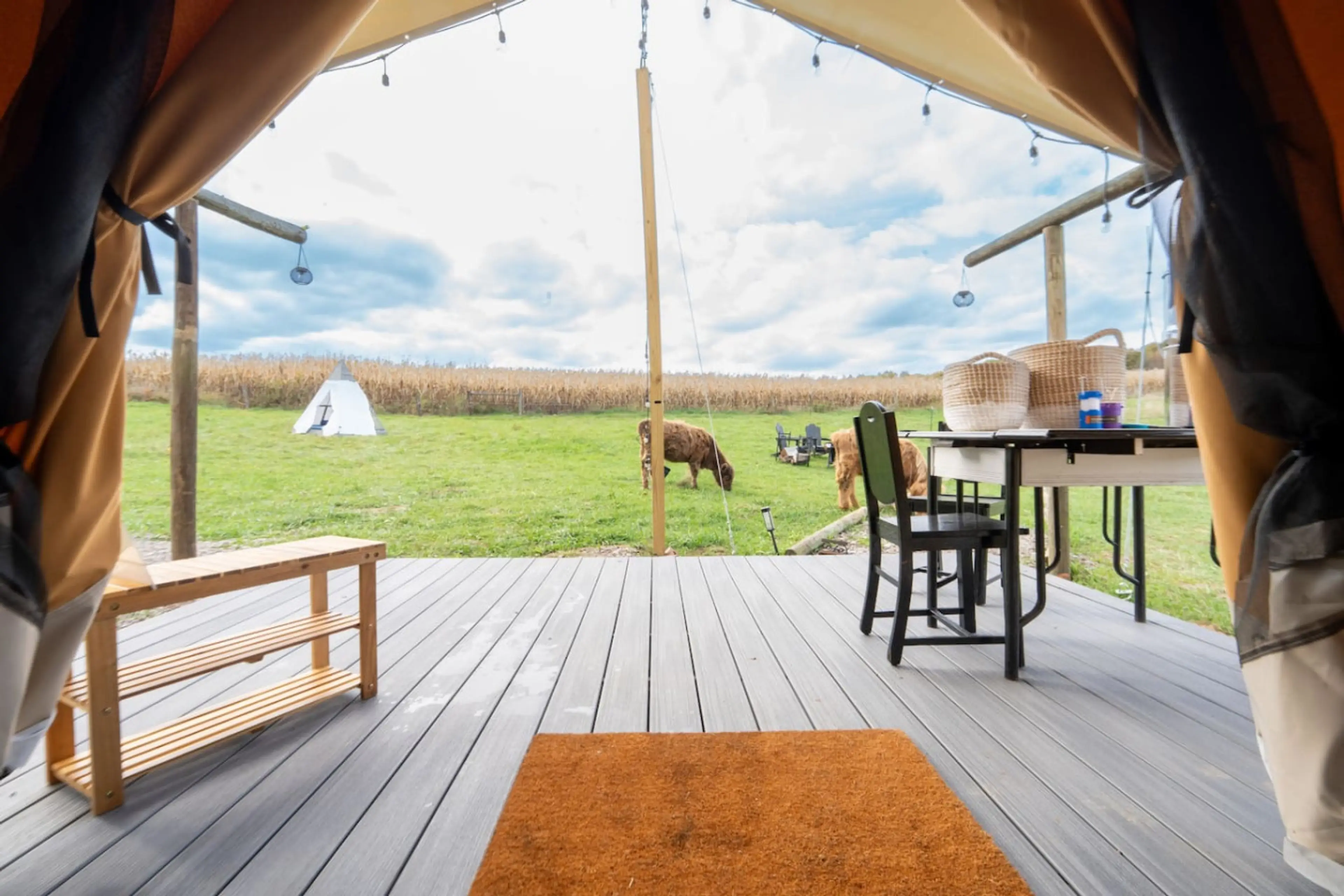 Stay in a luxury glamping tent nestled in the pasture with friendly Highland mini cows—your own private farm escape. Perfect for a romantic getaway or a cozy group retreat. Features a full bed, 2 heavy-duty cots (500 lb capacity each), wood-burning stove, mini fridge, outdoor daybed, large fire pit,...